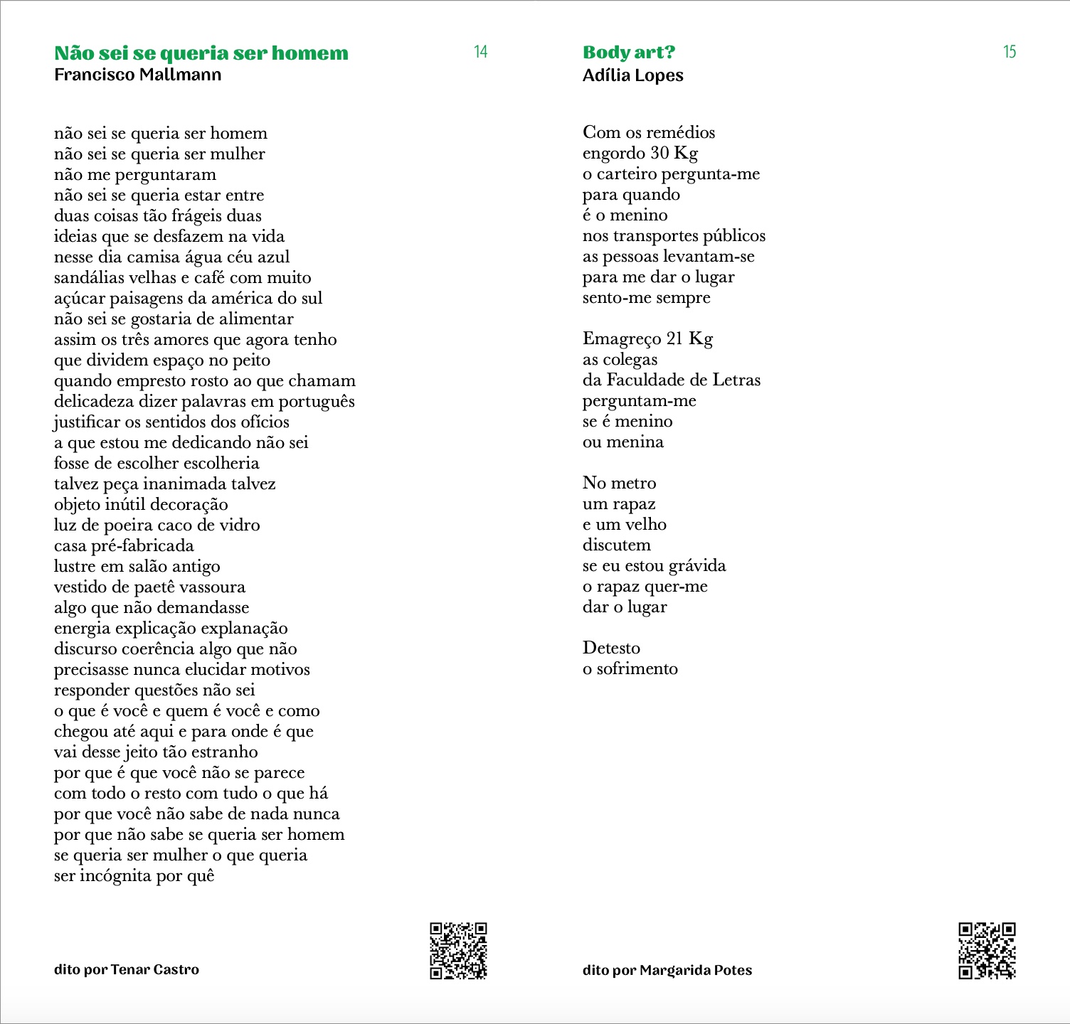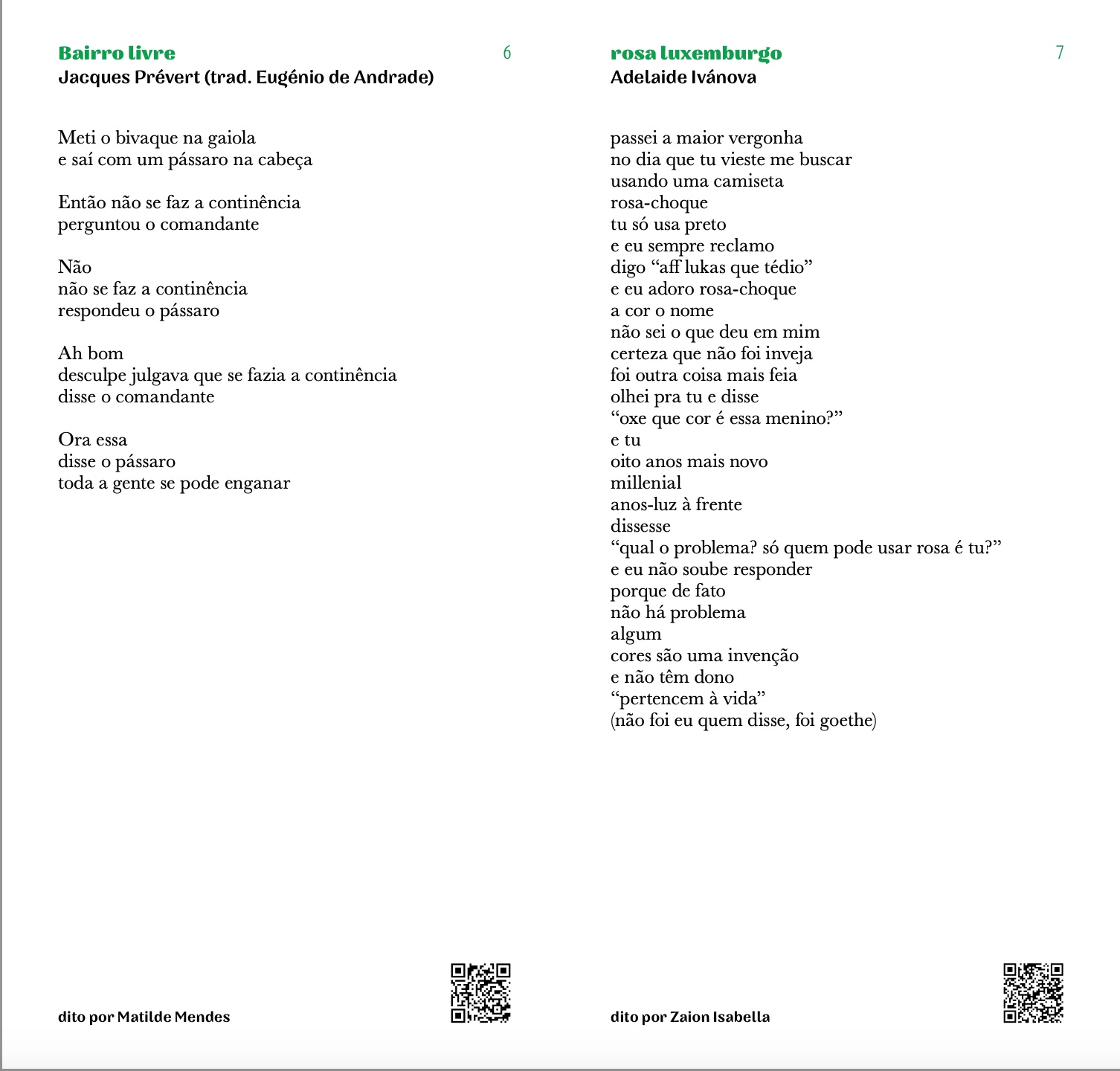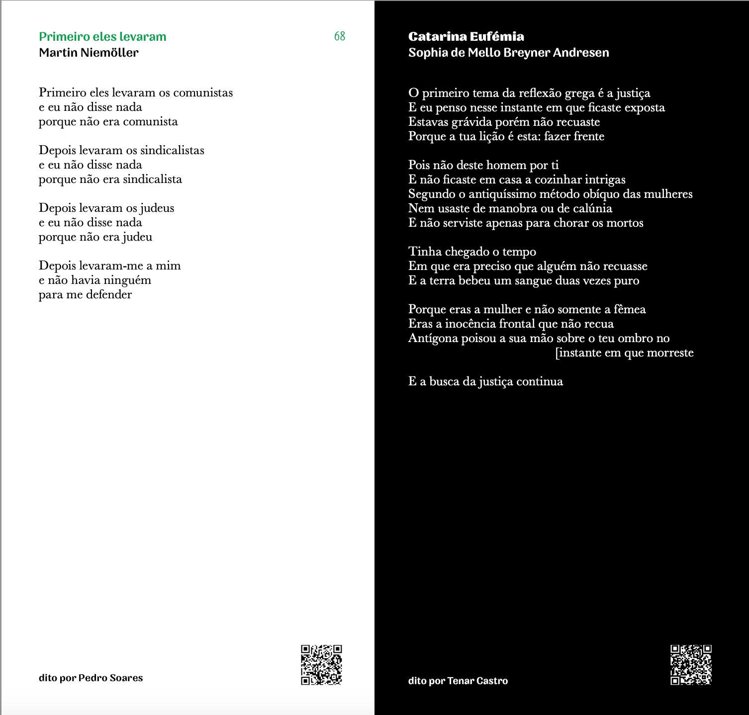Poemas: Adelaide Ivánova, Adília Lopes, Alberto Pimenta, Ana Hatherly, Ana Luísa Amaral, André Tecedeiro, António Gedeão, Armindo Rodrigues, Carlos de Oliveira, Conceição Evaristo, Eugénio de Andrade, Fernando Assis Pacheco, Fernando Namora, Ferreira Gullar, Francisco Mallmann, Helder Moura Pereira, Jaime Cortesão, Jacques Prévert, João Monge, José Afonso, José Carlos Ary dos Santos, José Gomes Ferreira, José Mário Branco, Luís Quintais, Manuela de Freitas, Manuel Alegre, Margaret Atwood, Margarida Vale de Gato, Maria Velho da Costa, Mário Cesariny, Mário Dionísio, Mário-Henrique Leiria, Martin Niemöller, Miguel Torga, Mohammed El-Kurd, Natália Correia, Nazim Hikmet, Noémia de Sousa, Pedro da Silva Martins, Rabindranath Tagore, Raquel Lima, Regina Guimarães, Ruy Belo, Sérgio Godinho, Shervin Hajipour, Sophia de Mello Breyner Andresen, Virgínia Dias.