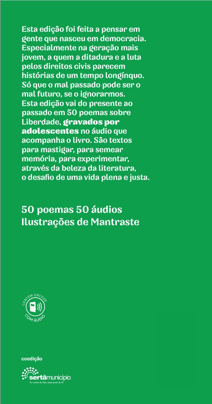Esta edição vai do presente ao passado em 50 poemas sobre Liberdade, gravados por adolescentes no áudio que acompanha o livro. São textos para mastigar, para semear memória, para experimentar, através da beleza da literatura, o desafio de uma vida plena e justa.