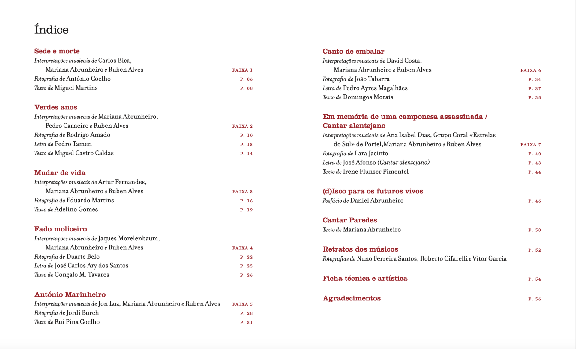 Músicos: Mariana Abrunheiro, Ruben Alves, Ana Isabel Dias, Artur Fernandes, Carlos Bica, David Costa, Jaques Morelenbaum, Jon Luz, Pedro Carneiro e o grupo coral Estrelas do Sul