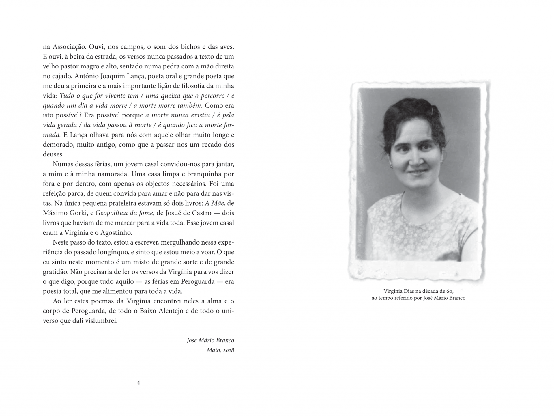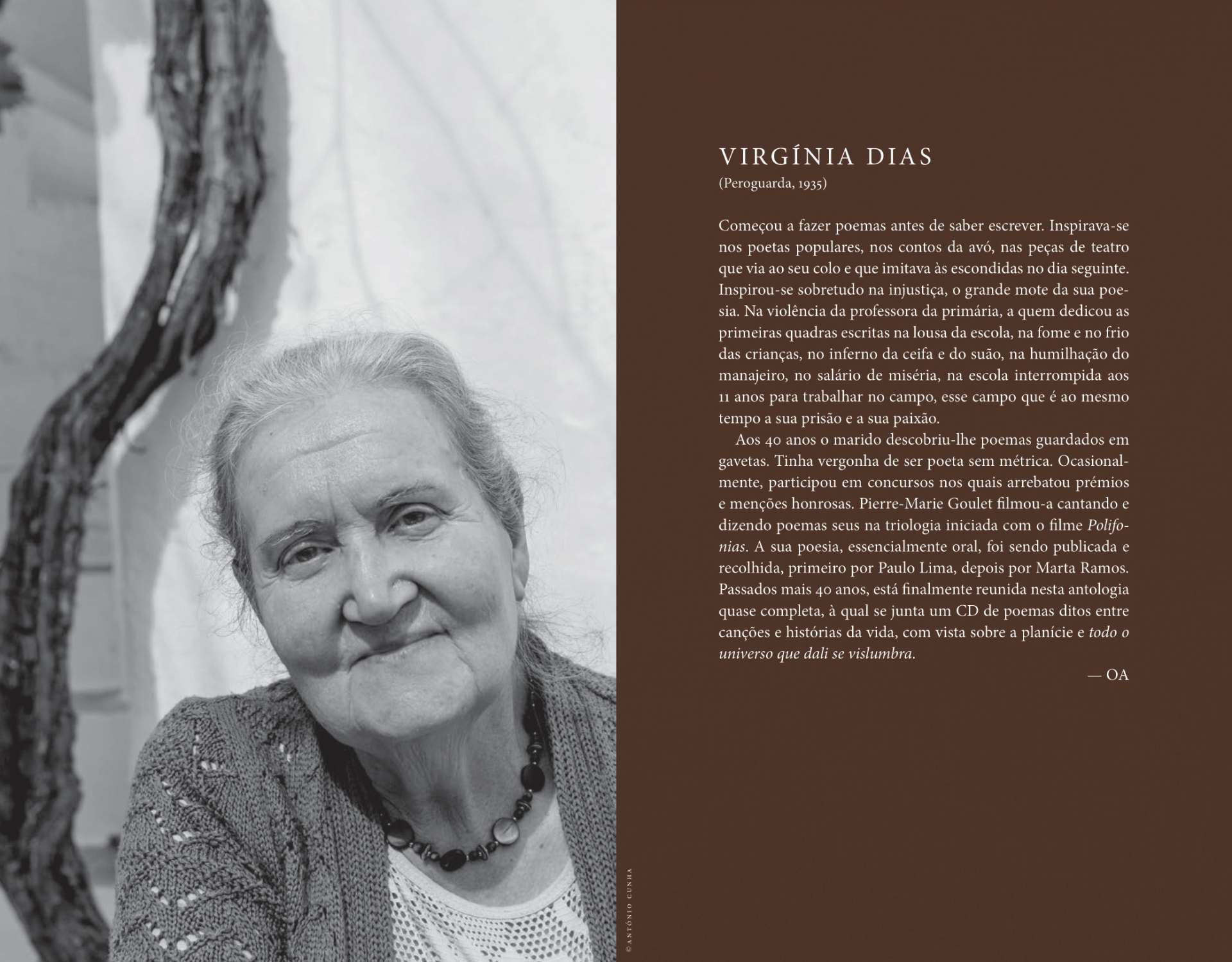 Virgínia Dias começou a fazer poemas antes de saber escrever. Inspirava-se nos poetas populares, nos contos da avó, nas peças de teatro que via ao seu colo e que imitava às escondidas. Inspirou-se sobretudo na injustiça, o grande mote da sua poesia. No inferno da ceifa e do suão, na humilhação do manajeiro, no salário de miséria, na escola interrompida aos 11 anos para ir trabalhar no campo, esse campo que é ao mesmo tempo a sua prisão e a sua paixão. Aos 40 anos, o marido descobriu-lhe poemas guardados em gavetas. Tinha vergonha de ser poeta sem métrica. Ocasionalmente, participou em concursos nos quais arrebatou prémios e menções honrosas. Pierre-Marie Goulet filmou-a cantando e dizendo poemas seus na trilogia iniciada com o filme Polifonias.