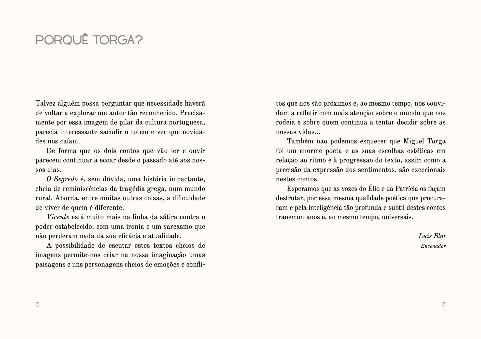 Em 2024, os contos escolhidos pela Peripécia Teatro foram “O Segredo” e “Vicente”, de Miguel Torga, publicados, respectivamente, nos livros Pedras Lavradas (1951) e Bichos (1940).