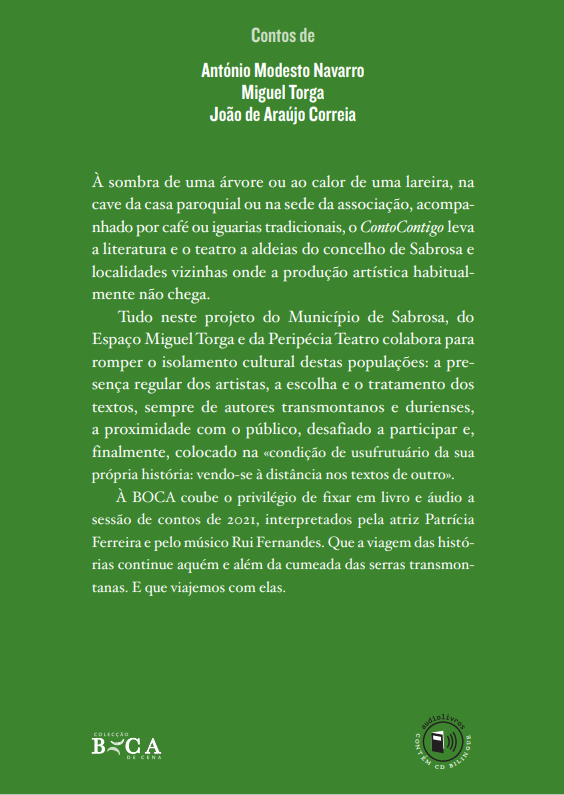 O prazer da escuta estende-se agora para além da cumeada das serras transmontanas, numa edição da BOCA que fixa em livro e áudio a sessão de contos de 2021, de António Modesto Navarro, João de Araújo Correia e Miguel Torga, interpretados pela atriz Patrícia Ferreira e pelo músico Rui Fernandes. Que a viagem das histórias continue. E que viajemos com elas!