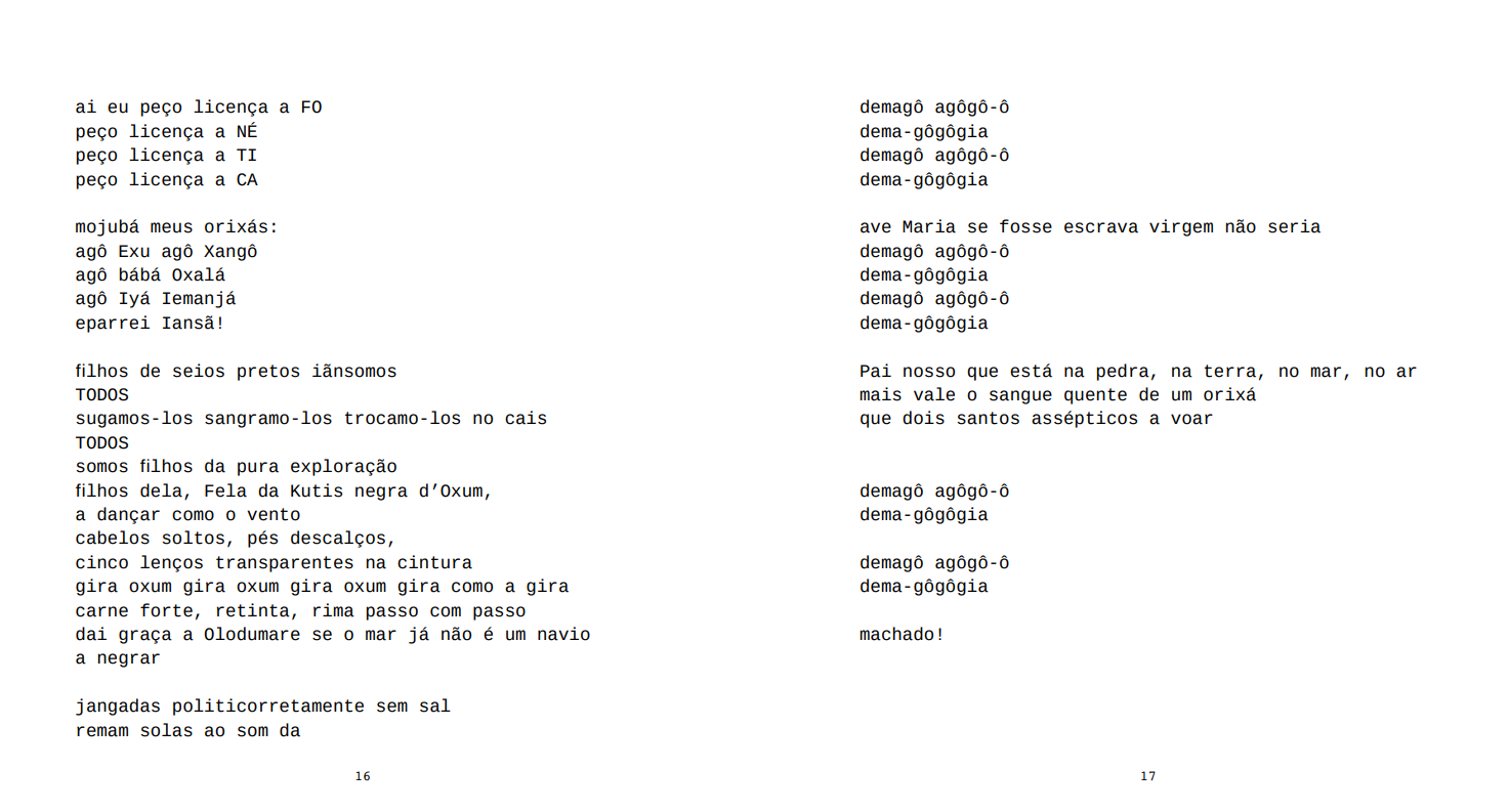 Dirão: teu livro é sal. E som magnético. Um sistema elétrico. Ponto final de terreiro. Mergulho e pulsação. Vem de longe essa afirmação. No vento, vem. No fogo, chamando. Na tua ancestralidade. Brasilidade antiga. Pré-histórica a pedra que lapidas. Atiras umas sobre as outras. Lascas. E estilhaços que formam ilhas de resistência. Foi assim que escutei o teu grito. Teu improviso. Ladainha. Reza. Novena. Reisado. És mais ímã do que rima. Fiquei, de fato, tocado. Tomado pelo teu silêncio. Fôlego. Saudade. Qualquer escrita é sobre essa falta que faz. Nosso povo. Dentro da gente nossos iguais. É o Brasil que levas contigo. Plantas no umbigo os segredos do mato. Os cantos sagrados. De cada poema. Uma voz-imagem. Uma língua pretoguesa, com certeza.